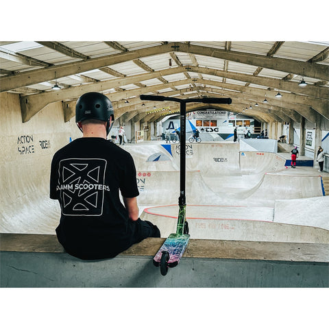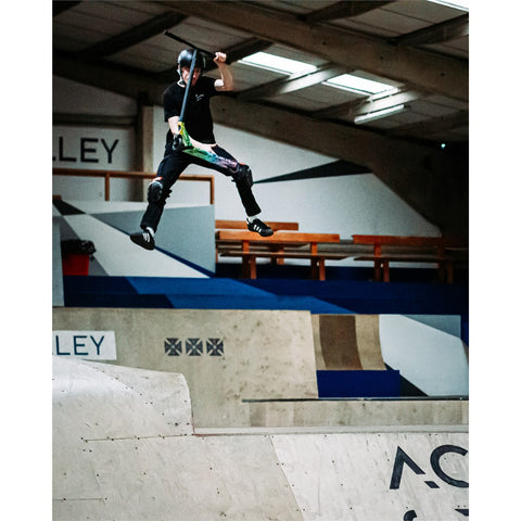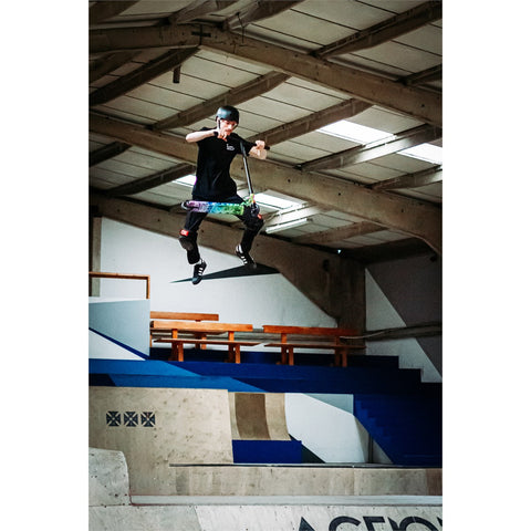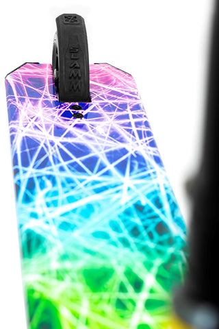 Strobe V4 is a premium scooter packed with performance components and visually impressive full hydro-wrapped decks. The Strobe V4 sees blacked out hollow core wheels, CNC double bolt clamp, and forged aluminium head fork to create a contrasting black silhouette against the energetic deck wraps. With a steel Riser T-Bar, deck blocks and impact resistant bar ends, the Strobe V4 continues the high quality expected in the range.